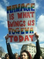Think about it. What’s so great about marriage? Besides the rights, I mean. And why should we have to rely on marriage to confer upon us basic human rights? Marriage is both a religious and a patriarchal institution. The fact that we have to buy into it in order to share birth, life, and death events with our lovers/partners/co-parents is just plain ludicrous. Insulting.