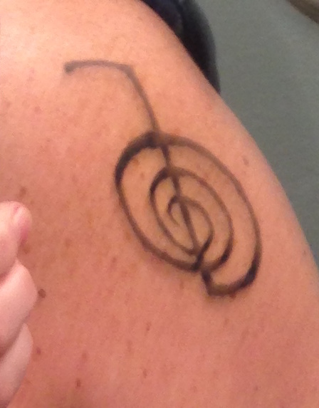 The Choku Rei symbol is used in Reiki to draw power to the parts of the body on which it is drawn. I figured my right shoulder and the radiculopathy could use some assistance. That, and it looks sweet. (Hopefully by the time T is for Tattoo rolls around, I’ll have a better picture).