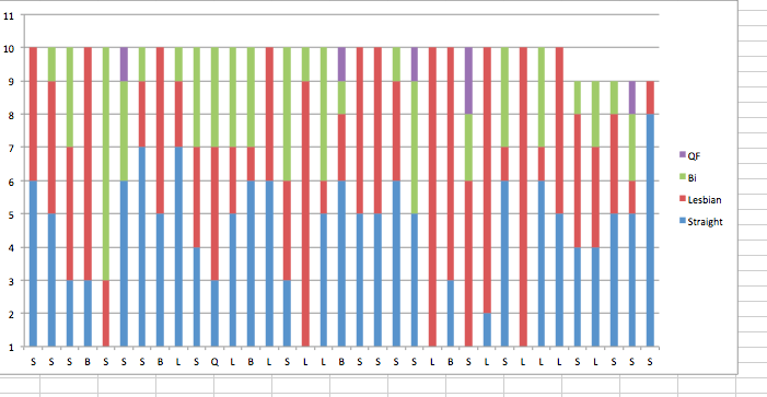 I wonder how many guessed ‘bi” to hedge their bets… I mean, this population is still largely invisible. That would be an interesting discussion. I find it interesting too that you were the only self-identified lesbian in the class – and the ‘we can’t do that’ attitude of several in the class (if we don’t talk about it, don’t confront it…. ). Blech. The conversation was important.
